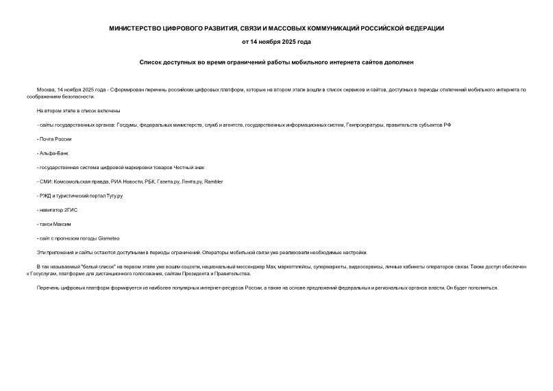 Статус: Информационный документ Текст документа: присутствует в коммерческой версии NormaCS Утвержден: Минцифры России; Министерство связи и массовых коммуникаций Российской Федерации, 14.11.2025 Обозначение: Информация Наименование: Список доступных во время ограничений работы мобильного интернета сайтов дополнен Дополнительные сведения: доступны через сетевой клиент NormaCS. После установки нажмите на иконку рядом с названием документа для его открытия в NormaCS